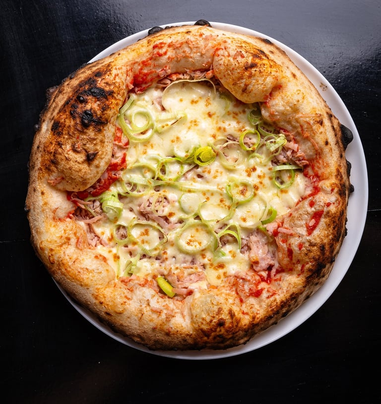 Molho de tomate italiano, queijo muçarela, peito de peru, alho poró e catupiry (original).